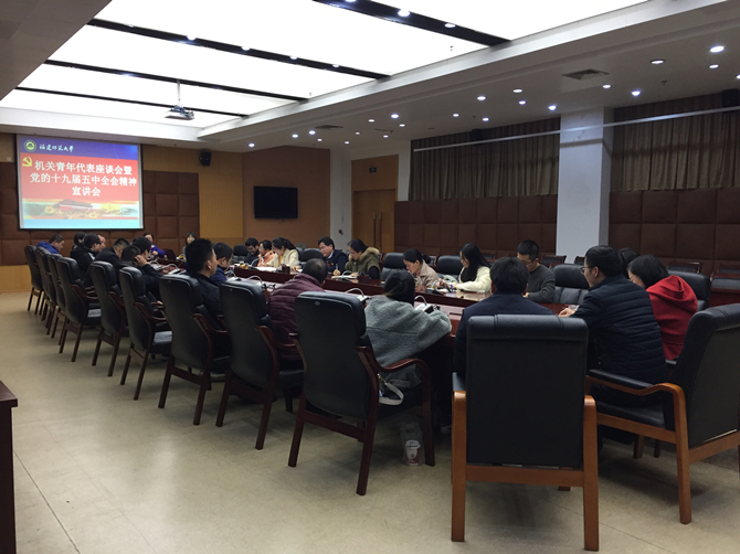 12月16日,机关党委在旗山校区第十会议室召开机关青年代表座谈会,学习贯彻党的十九届五中全会精神。机关党委主持工作副书记陈金章、副书记李岩丽,机关部分青年代表参加了会议。