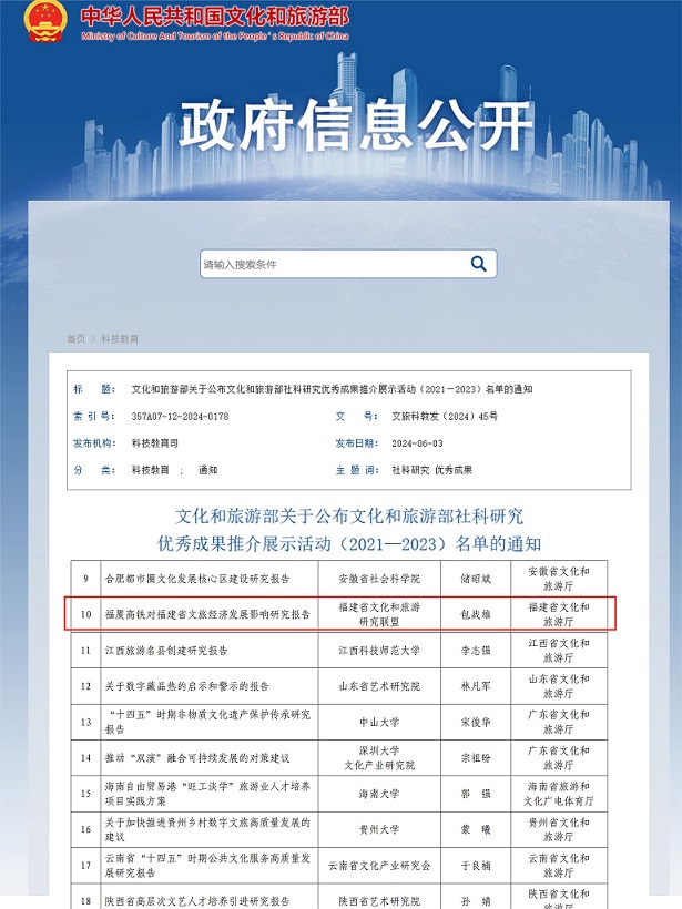 此前,由该课题研究报告提炼出的资政报告《抓住福厦高铁开通机遇,做大做强做优文旅经济——关于福厦高铁助推我省文旅经济发展的几点建议》,在中共福建省委政策研究室《政研专报》2023年第23期刊发,并获赵龙省长等多位省领导的肯定性批示。