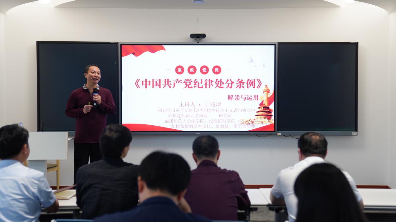 丁兆增副教授从《中国共产党纪律处分条例》(以下简称《条例》)的制定背景、修订历程、修订背景及特点、修订内容、修订亮点等方面进行系统解读。他强调,全面从严治党成为新时代党的建设的鲜明主题,此次修订的《条例》为进一步加强党的纪律建设提供了重要遵循。他结合热点案例和工作实际,以案示警、以案明纪,引导广大党员学纪、知纪、明纪、守纪。