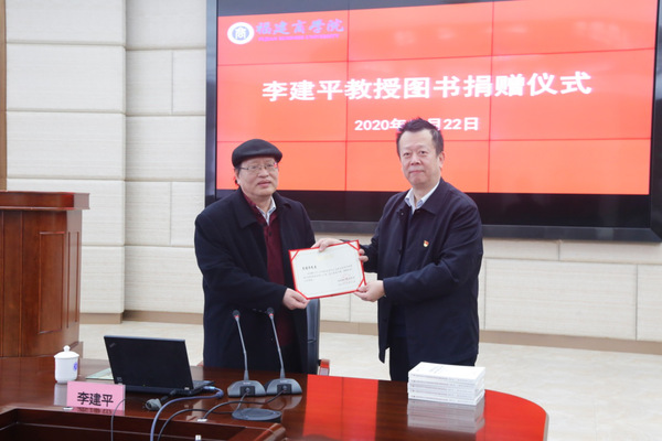 福建商学院党委书记刘剑津向李建平教授颁发赠书证书
