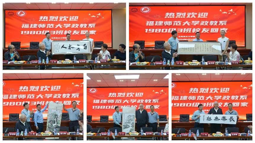 校友代表依次向学院、恩师赠送字画,共同观看了《四十四年同窗拾贝》视频,参观了校老照片馆及马克思主义理论学科群展览馆。